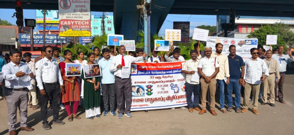 மதுரை காளவாசல் பகுதியில் திலகர் திடல் போக்குவரத்து காவல் ஆய்வாளர் தங்கமணி தலைமையில் அண்ணா பல்கலைகழக மாணவர்கள்,பேராசிரியர்கள் இணைந்து பொதுமக்களுக்கும், வாகன ஓட்டிகளுக்கும் துண்டு பிரசுரம் வழங்கியும், போக்குவரத்து விழிப்புணர்வு பாதாகைகளுடன் சாலைப்பாதுகாப்பு குறித்து விழிப்புணர்வு ஏற்படுத்தினர்..