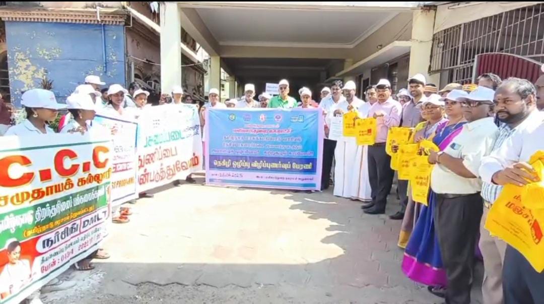 பிளாஸ்டிக் பை ஒழிப்பு குறித்த விழிப்புணர்வு பிரச்சார பேரணி, மாவட்ட ஆட்சியர் துவக்கி வைத்தார். நூற்றுக்கும் மேற்பட்ட மாணவிகள், தூய்மை பணியாளர்கள் பங்கேற்றனர்.