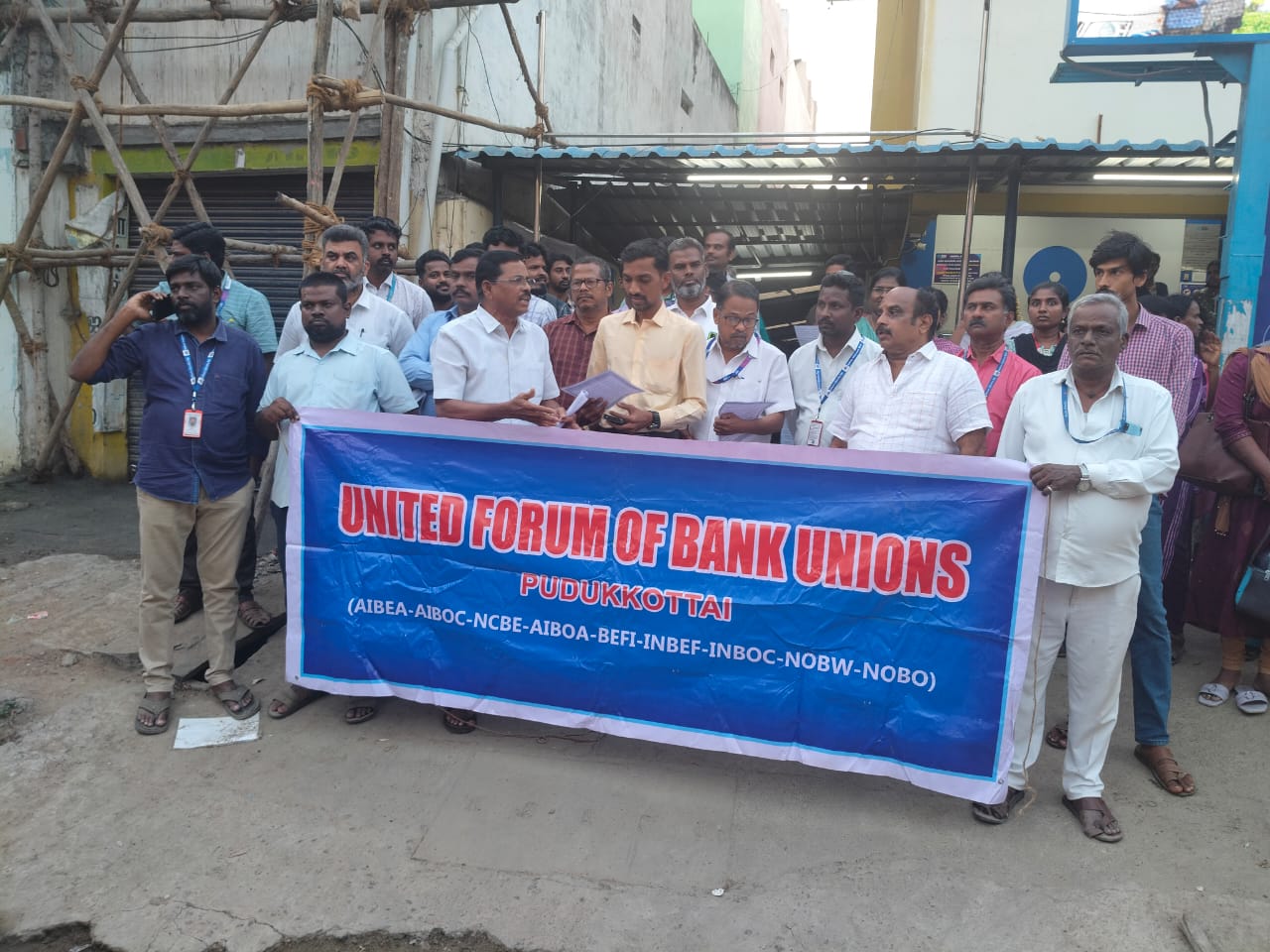 இந்த கோரிக்கையை வலியுறத்தி புதுக்கோட்டை கீழராஜவிதி ஸ்டேட் வங்கி முன்பாக ஆர்ப்பாட்டம் நடைபெற்றது. தலைமை: ஸ்டேட் வங்கி அதிகார நிர்வாகி Regional Secretary குருநாதன்,ஆரோக்கிய சார்லஸ் முன்னிலை: கிஷோர் , பிரதீப், IOB சங்க நிர்வாகி சேதுராமன், PCC Bank மாவட்ட செயலாளர் அருணாசலம், இந்தியன் வங்கி தொழிற் சங்க நிர்வாகிகள் ராமமூர்த்தி, பிரபு, கார்த்திகேயன் KVB பாலகப்பிரமணியன், நன்றியுரை : சந்தியா ஸ்டேட் பாங்க ஆப் இந்தியா.