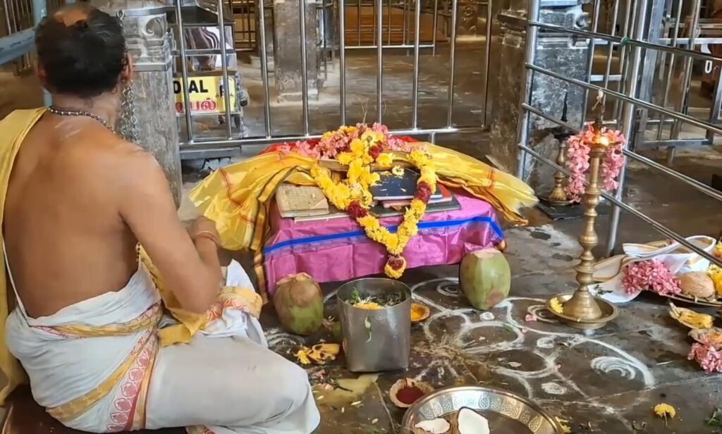 திருநள்ளாரில் நவராத்திரியை ஒட்டி உலக பிரசித்தி பெற்ற ஸ்ரீதர்ப்பாரண்யேஸ்வரர் ஆலயத்தில் சரஸ்வதி பூஜையை முன்னிட்டு ஓலைச்சுவடிக்கு பாவனா அபிஷேகம் மற்றும் மகா தீபாராதனை நடைபெற்றது. ஏராளமான பக்தர்கள் கலந்து கொண்டு சுவாமி தரிசனம் செய்தனர்.