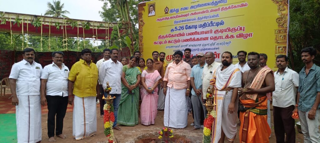 தமிழ்நாடு அரசு இந்து சமய அறநிலையத்துறை சார்பில் திருச்சிராப்பள்ளி திருவானைக்காவல் அருள்மிகு ஜம்புகேஸ்வரர் அகிலாண்டேஸ்வரி திருக்கோவிலில் ரூபாய் ஐந்து கோடியே இருபத்தாறு லட்சம் மதிப்பீட்டில் திருக்கோயில் பணியாளர்கள் குடியிருப்பு கட்டிடம் கட்டும் பணிக்கான தொடக்க விழா காணொளி காட்சி வாயிலாக தமிழ்நாடு முதலமைச்சர் மு க ஸ்டாலின் அவர்கள் இன்று தொடங்கி வைத்தார்.