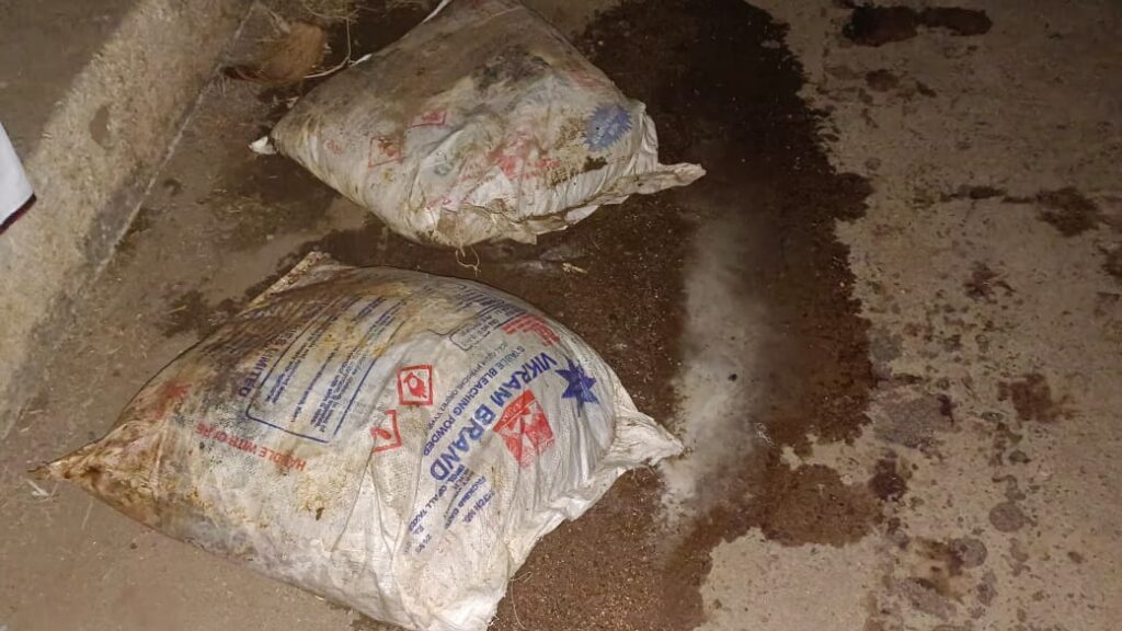 கோவை மாவட்டம், சூலூர் அடுத்த ராசிபாளையம், அருகம்பாளையம் உள்ளிட்ட கிராமங்களில் விவசாய நிலங்கள் பரவலாக உள்ளன. இப்பகுதியில் உள்ள விவசாய நிலங்கள் நொய்யல் ஆற்றின் கிளை கால்வாய் மூலம் பாசன வசதி பெறுகின்றன. இந்நிலையில், சோமனூர் சாலையில் உள்ள தரைப்பாலத்திற்கு கீழே அமைந்துள்ள துணைக் கால்வாயில், கடந்த சில நாட்களுக்கு முன்பு மர்ம நபர்கள் 30-க்கும் மேற்பட்ட ப்ளீச்சிங் பவுடர் மூட்டைகளை வீசிவிட்டுச் சென்றது தெரியவந்துள்ளது.