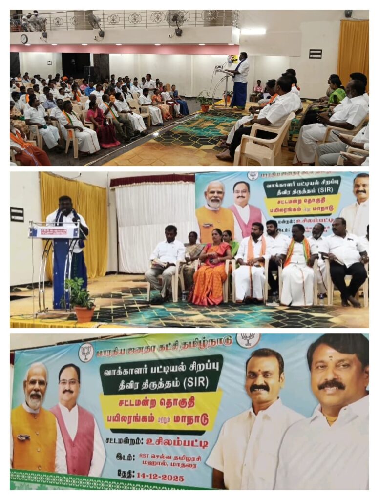 இதன் ஒரு பகுதியாக மதுரை மாவட்டம் உசிலம்பட்டியில் உள்ள தனியார் திருமண மண்டபத்தில் உசிலம்பட்டி சட்டமன்றத் தொகுதி பாஜக கட்சி சார்பில் வாக்காளர் பட்டியல் சிறப்பு தீவிர திருத்தம் ( எஸ்ஐ ஆர் ) குறித்து ஆலோசனைக் கூட்டம் நடைபெற்றது.,