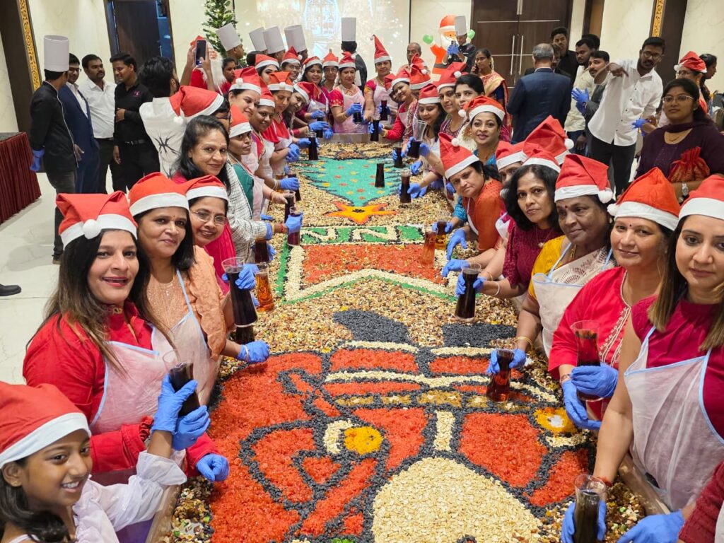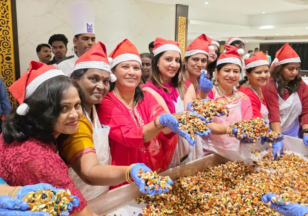அதன் நிறுவன தலைமை சமையல் கலை நிபுணர் ராஜா தலைமையில் நடைபெற்ற ஆயிரம் கிலோ எடையிலான கேக் தயாரிக்கும் நிகழ்ச்சியில் விடுதி ஊழியர்கள் மற்றும் 50-க்கும் மேற்பட்ட பெண்கள் பங்கேற்று இருந்தனர்.அதில் பிரபல நிறுவனமான மார்ட்டின் குழும நிறுவனங்களின் இயக்குனர் லீமா ரோஸ் மார்ட்டின் சிறப்பு விருந்தினராக பங்கேற்ற நிலையில் சிவப்பு நிற உடையில் தலையில் சிவப்பு நிற கிறிஸ்துமஸ் தொப்பி அணிந்து நிகழ்ச்சியில் பங்கேற்ற பெண்கள் அங்கிருந்த ராட்சத ட்ரேயில் கிறிஸ்துமஸ் மரம் நட்சத்திரம் மற்றும் ஏசு கிறிஸ்து போன்று பரப்பி வைக்கப்பட்டிருந்த உலர் பழங்களில் பிராந்தி, விஸ்கி,ரம், ஒயின் போன்ற மதுபானங்களை ஊற்றி கலவையை உருவாக்கினர். முந்திரி, பாதாம், பிஸ்தா, கிஸ்மிஸ், செர்ரி, பேரிச்சை, அத்திப்பழம், ப்ளூபெர்ரி உட்பட பத்துக்கும் மேற்பட்ட உலர் பழங்கள் சுமார் 300 கிலோ எடையில் அங்கு வைக்கப்பட்டிருந்த சூழலில் அதில் சுமார் 100 லிட்டருக்கும் மேல் மதுபானங்கள் மற்றும் தேன் ஆகியவற்றை ஊற்றிய பெண்கள் தங்கள் கைகளால் அதனை கலந்தபடியே கிறிஸ்துமஸ் பாடல்களை பாடியும் கிறிஸ்துமஸ் வாழ்த்துகளை பகிர்ந்தும் தங்கள் மகிழ்ச்சியை வெளிப்படுத்தினர்.