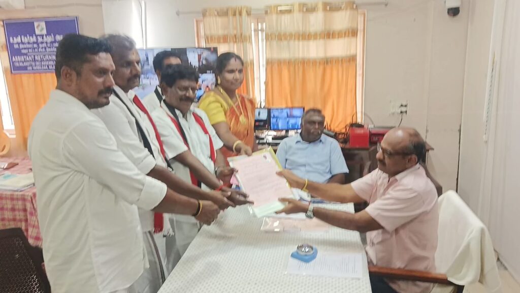 அப்போது அவருடன் நிலக்கோட்டை நால்ரோட்டில் இருந்து கட்சி நிர்வாகிகள் பெண்கள் உட்பட ஏராளமான மக்கள் ஊர்வலமாக வந்து வேட்பு மனுவை தாக்கல் செய்ய வந்தனர்.