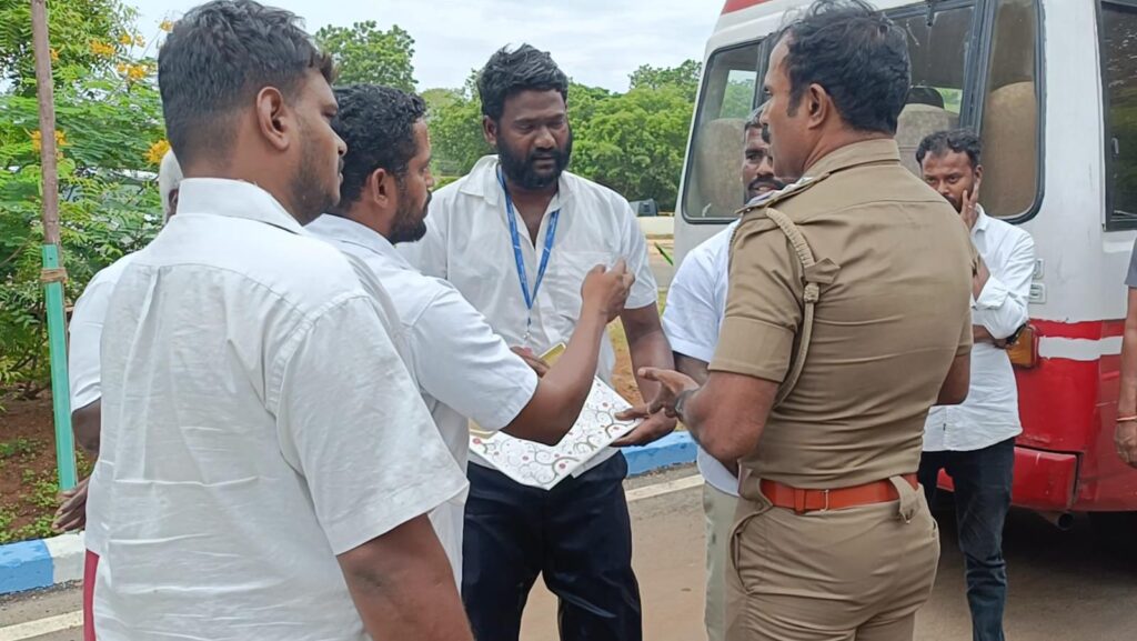 அப்போது செயலாளர் ராஜேந்திரன் தனது உடலில் பெட்ரோலை ஊற்றி தீக்குளிக்க முயன்றனர். அப்போது அங்கு பாதுகாப்பு பணியில் ஈடுபட்டிருந்த காவல்துறையினர் அவர்களை தடுத்து நிறுத்தி தண்ணீர் ஊற்றி காப்பாற்றினர். இதனால் அங்கு சிறிது நேரம் பரபரப்பு ஏற்பட்டது.