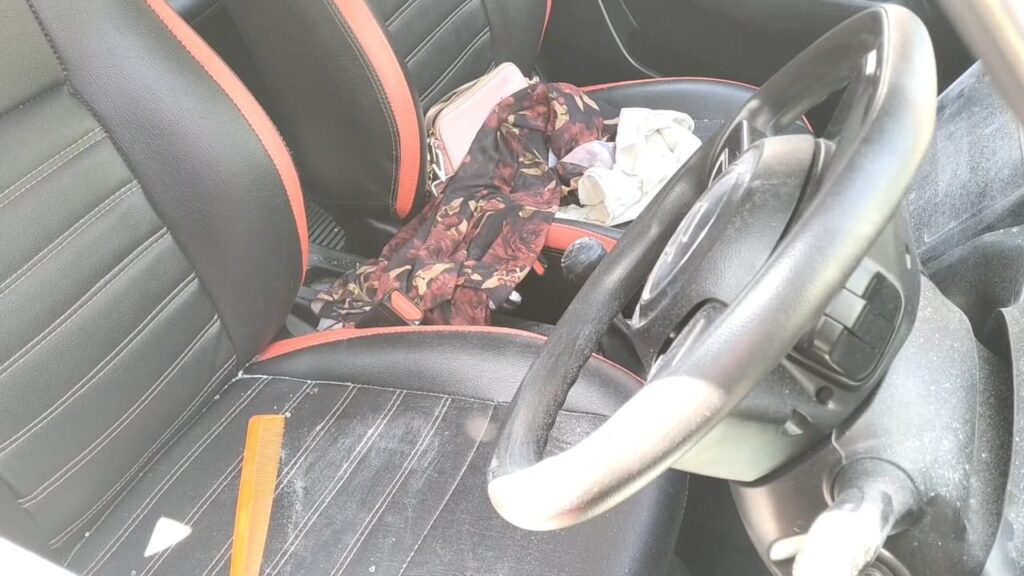 காருக்குள் கண்ணாடி சில்களும் பெண்கள் பயன்படுத்தும் மணி பர்ஸ் ஆகியவை உள்ளது