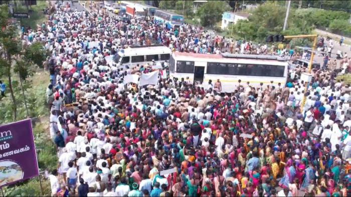 கிட்டத்தட்ட 18 கி.மீ. தூரத்தை 7 மணி நேர பயணமாக கடந்து, விவசாயிகள், பெண்கள் என பல்லாயிரக்கணக்கானவர்கள், மதுரை தமுக்கம் மைதானத்துக்கு வந்து திரண்டனர். போராட்டத்தில் ஈடுபட்டவர்களிடம், தென் மண்டல ஐ.ஜி பிரேம் ஆனந்த் சின்ஹா. உள்ளிட்ட அதிகாரிகள் பேச்சுவார்த்தை நடத்தினர்.பின்னர் போலீசார் பேச்சுவார்த்தை நடத்தியதை ஏற்று மக்கள் கலைந்து சென்றனர்.