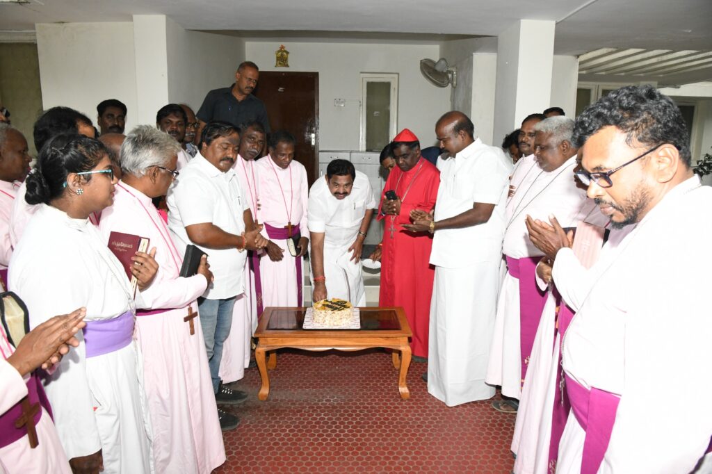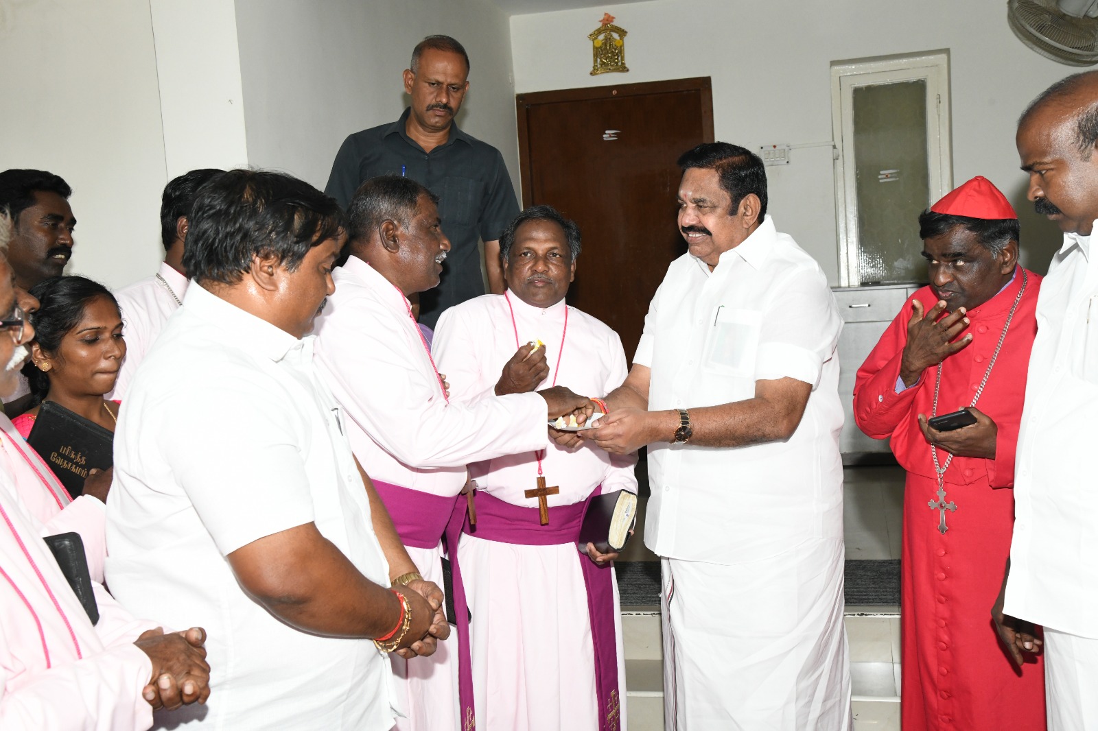 எதிர்க்கட்சி தலைவர் எடப்பாடி பழனிச்சாமியை சந்தித்து அவரது முன்னிலையில் கேக் வெட்டி கிறிஸ்மஸ் மற்றும் புத்தாண்டு வாழ்த்துக்களை தெரிவித்தனர்.