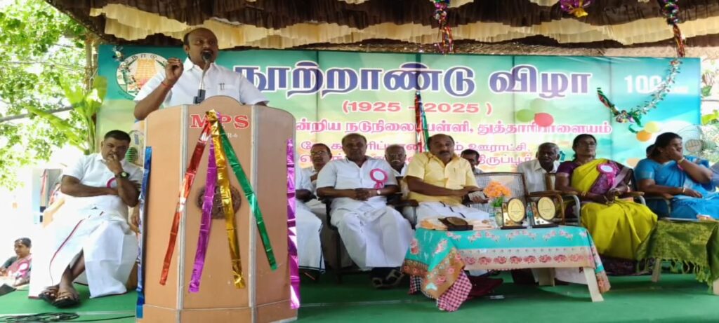 திருப்பூர் மாவட்டம் பல்லடம் அருகே துத்தேரிபாளையம் பகுதியில் 100 ஆண்டுகளாக செயல்பட்டு வரும் ஊராட்சி ஒன்றிய நடுநிலைப்பள்ளியில் நூற்றாண்டு விழா அப்பகுதி மக்கள் மற்றும் முன்னாள் மாணவர்கள் சார்பில் கொண்டாடப்பட்டது.