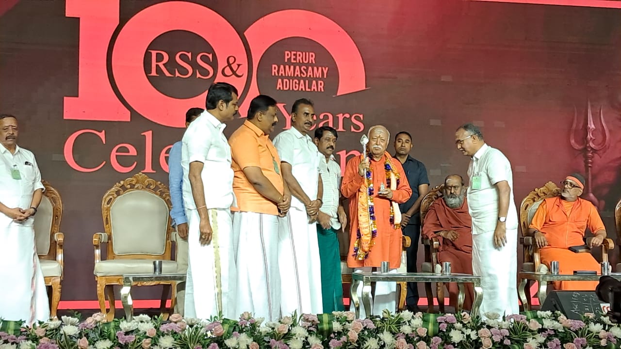 கோவையில் நடைபெற்று வரும் RSS நூற்றாண்டு விழாவில் அதிமுக முன்னாள் அமைச்சர் எஸ்.பி வேலுமணி, ஆர்எஸ்எஸ் தலைவர் மோகன் பகவத் உள்ளிட்டோர் நூற்றாண்டு விழாவில் பங்கேற்று உள்ளனர்.