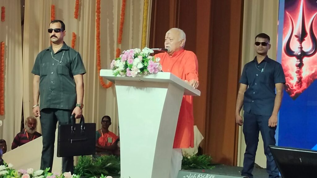 விழா மேடைக்கு வருகை தந்த மோகன் பகவத்திற்கு முருகப்பெருமானின் வேல் கொடுத்து வரவேற்பு கொடுக்கப்பட்டுள்ளது குறிப்பிடத்தக்கது.