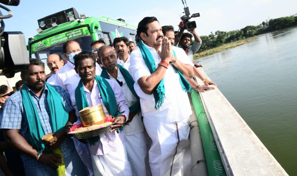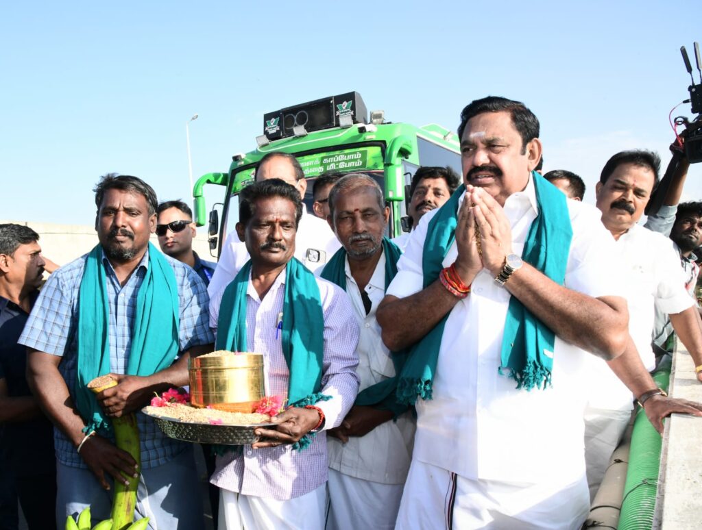 விவசாயிகள் ஆழாக்கில் அரிசி மற்றும் பூக்களை நிரப்பி இபிஎஸ் கையில் கொடுத்து, “அய்யா உங்களது பொன்னான கைகளால் அரிசியையும், பூக்களையும் காவிரி ஆற்றில் தூவுங்கள், இதனால் விவசாயிகளின் வாழ்வாதாரம் செழிக்கும்” என்று வேண்டுகோள் விடுத்தனர். உடனே இபிஎஸ் மகிழ்ச்சியுடன் அரிசியையும், பூக்களையும் காவிரி ஆற்றில் தூவினார். இதையடுத்து இபிஎஸ்ஸிடம் பேசிய விவசாயிகள், ‘’காவிரி மற்றும் துணை ஆறுகளை சுத்தப்படுத்தும் வகையில், ‘நடந்தாய் வாழி காவிரி’ திட்டத்தைக் கொண்டுவந்தீர்கள்.