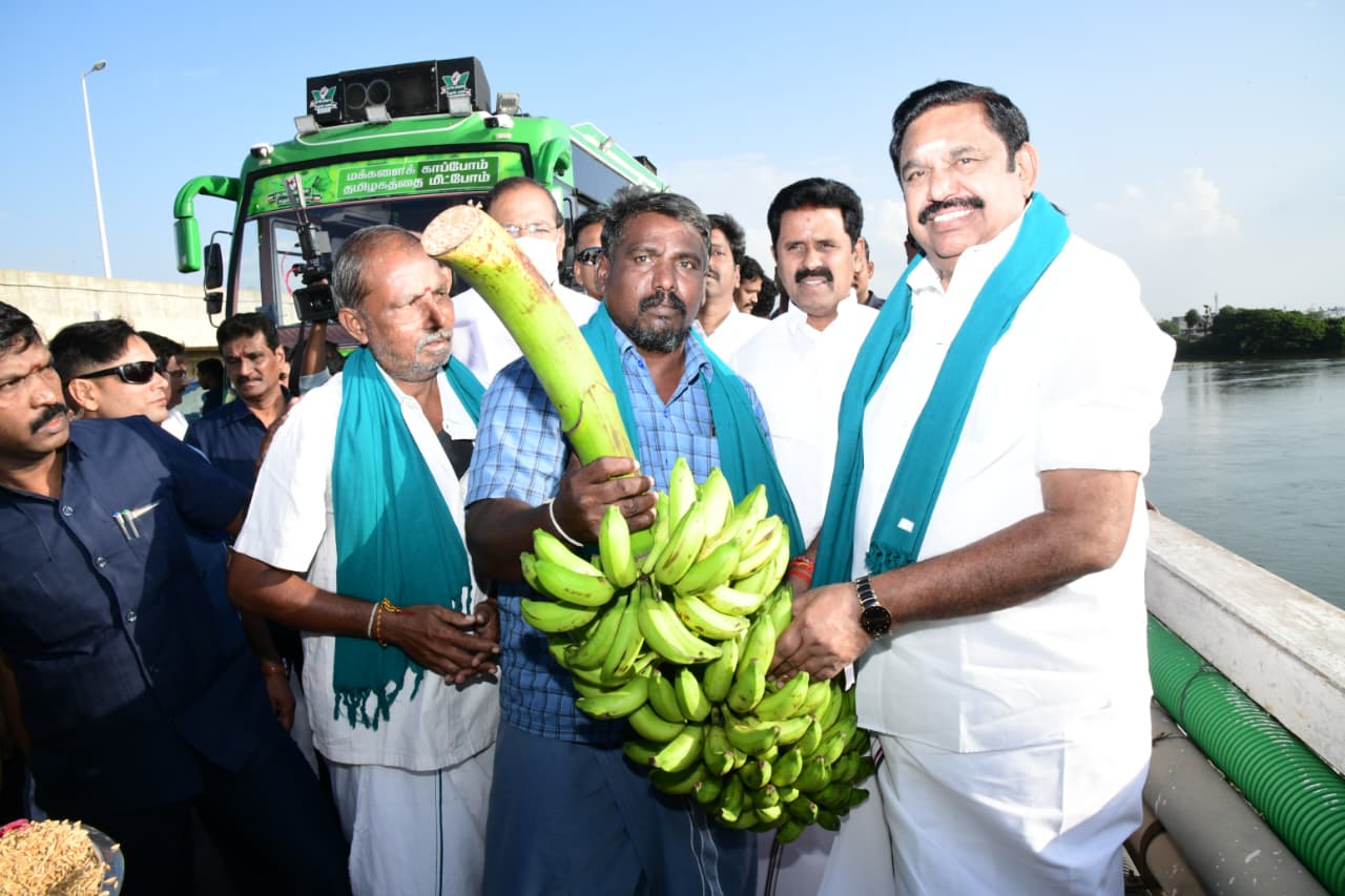 விவசாயிகள் ஆழாக்கில் அரிசி மற்றும் பூக்களை நிரப்பி இபிஎஸ் கையில் கொடுத்து, “அய்யா உங்களது பொன்னான கைகளால் அரிசியையும், பூக்களையும் காவிரி ஆற்றில் தூவுங்கள், இதனால் விவசாயிகளின் வாழ்வாதாரம் செழிக்கும்” என்று வேண்டுகோள் விடுத்தனர். உடனே இபிஎஸ் மகிழ்ச்சியுடன் அரிசியையும், பூக்களையும் காவிரி ஆற்றில் தூவினார். இதையடுத்து இபிஎஸ்ஸிடம் பேசிய விவசாயிகள், ‘’காவிரி மற்றும் துணை ஆறுகளை சுத்தப்படுத்தும் வகையில், ‘நடந்தாய் வாழி காவிரி’ திட்டத்தைக் கொண்டுவந்தீர்கள்.