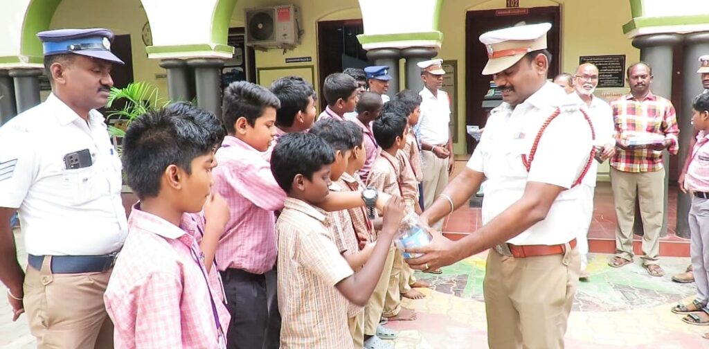 உடன் பள்ளி தலைமை ஆசிரியர் நாராயணன்,, போக்குவரத்து சார்பு ஆய்வாளர்கள் லிங்ஸ்டன், பாண்டியராஜன்.. காவலர்கள்,, பள்ளி ஆசிரியர்கள், மாணவர்களின் பிரதிநிதிகள் கலந்து கொண்டனர்..