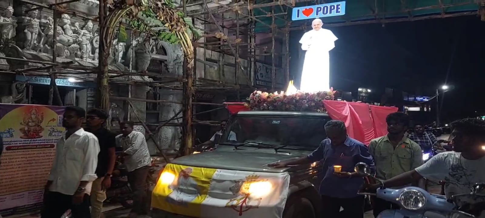 உடல்நலக்குறைவால் பாதிக்கப்பட்டிருந்த போப் பிரான்சிஸ் மறைவு செய்தி அறிந்து உலகம் முழுவதும் உள்ள கத்தோலிக்க கிறிஸ்துவ மக்கள் சோகத்தில் ஆழ்ந்துள்ளனர். இந்நிலையில் இந்திய அரசு மூன்று நாள் துக்கம் அனுசரிக்கிறது. உலகம் முழுவதும் பல்வேறு தலைவர்கள் அவருக்கு இரங்கல் தெரிவித்து வரும் நிலையில், காரைக்கால் மாவட்டத்தில் கிறிஸ்தவர்கள் மறைந்த போப் பிரான்சிஸ்க்கு அஞ்சலி செலுத்தினர்.