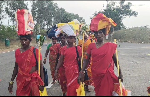 தாங்கள் வேண்டுதலுக்காகவும் வழிநடைக்கு துணையாகவும் கொண்டு வந்த மஞ்சள் தடவிய கம்புகளை பக்தர்கள் எடுத்து செல்கின்றனர்.