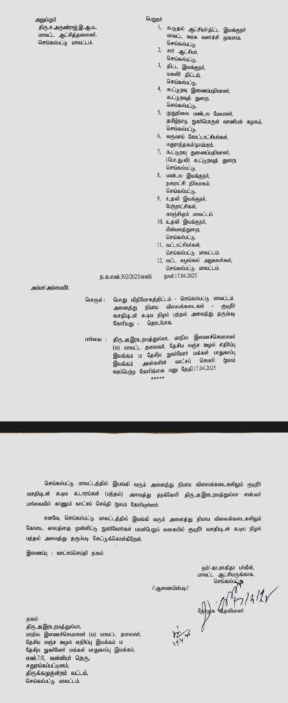 தேசிய நுகர்வோர் மக்கள் பாதுகாப்பு இயக்கத்தின் கோரிக்கையை ஏற்று, மாவட்ட ஆட்சியர் அனைத்துதுறை அதிகாரிகளுக்கு கடிதம் அனுப்பியுள்ளார்.
