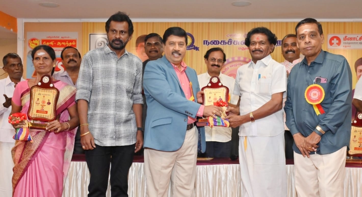 மதுரை மீனாட்சி மிஷன் மருத்துவமனையில் மக்கள் மருத்துவர் டாக்டர் ந.சேதுராமன், மருத்துவச்செம்மல் டாக்டர் எஸ்.குருசங்கர் ஆகியோர் நல்லாசியுடன் நாடக நடிகர் எஸ்.எம்.காளிமுத்து மற்றும் நாடக நடிகை எஸ்.டி.தாமரைச்செல்வி அவர்களுக்கு நகைச்சுவை மன்ற தலைவர், செயலர், பட்டிமன்ற நடுவரும், பேராசிரியரும், நடிகருமான முனைவர் கு. ஞானசம்பந்தன், நகைச்சுவை மன்ற அமைப்பு செயலாளர் வி.எம்.பாண்டியராஜன் இணைந்து விருதும், ரொக்கப் பரிசும் வழங்கினார்கள். உடன் குறும்பட இயக்குனரும், நடிகரும், தென்னிந்திய நடிகர் சங்க உறுப்பினரும், சமூக சேவகருமான சேவா ரத்னா டாக்டர் ஜெ.விக்டர், அக்ரி ஆறுமுகம், ‌ஜீ.இளங்கோவன், எம்.ஜெகதீசன், பால.கார்த்திகேயன் மற்றும் பலர் கலந்து கொண்டனர். விழாவில் நகைச்சுவை கூறிய அனைத்து குழந்தைகளுக்கும் பரிசுகள் வழங்கப்பட்டன. நல் உள்ளங்களை தேர்வு செய்து விருது வழங்கி கௌரவித்தது என்பது குறிப்பிடத்தக்கது. அனைவருக்கும் சிற்றுண்டியும், தேநீரும் வழங்கப்பட்டது. விழா முடிவில் அனைவருக்கும் அறுசுவை உணவு வழங்கப்பட்டது. விழா ஏற்பாட்டினை மீனாட்சி மிஷன் மருத்துவமனை ஊழியர்களும், நகைச்சுவை மன்ற உறுப்பினர்களும், ஒருங்கிணைப்பாளர் ஏ.இஸ்மத் இணைந்து செய்து வருகை புரிந்த அனைவருக்கும் நன்றி கூறினார்.