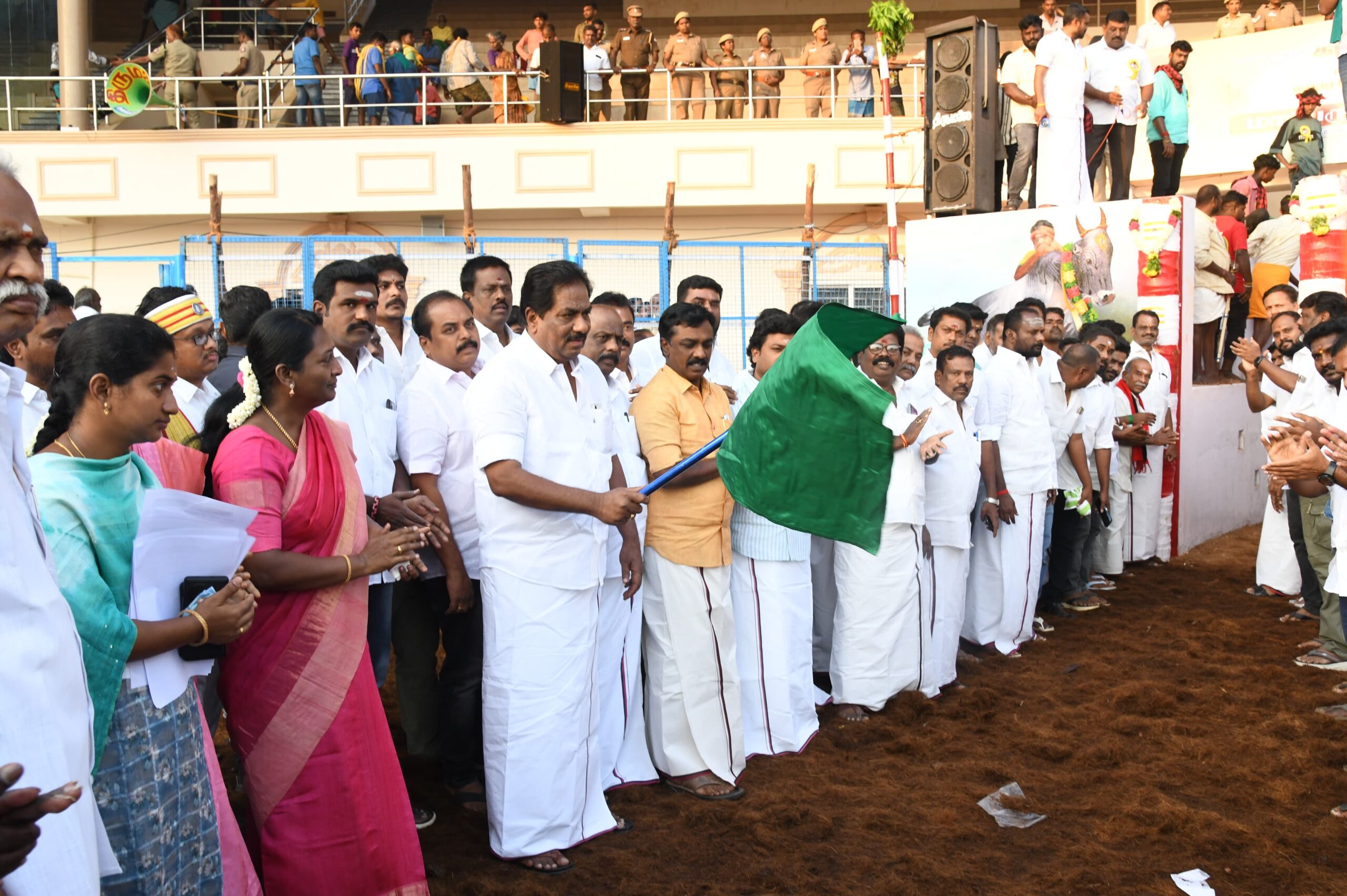 அலங்காநல்லூர் அருகே கலைஞர் நூற்றாண்டு ஏறுதழுவல் அரங்கத்தில் ஜல்லிக்கட்டு போட்டி வணிகவரித்துறை அமைச்சர் மூர்த்தி தொடங்கி வைத்தார்.