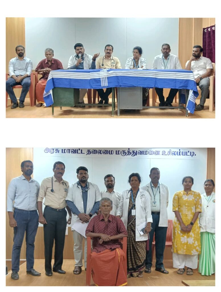 அனைத்து பரிசோதனைகளும் செய்ததுடன், முதல்வரின் மருத்துவ காப்பீட்டு திட்டத்தின் கீழ் பதிவு செய்து கடந்த 9 ஆம் தேதி உசிலம்பட்டி அரசு மருத்துவமனை மருத்துவ குழுவினர் 5 மணி நேர உயர்தர அறுவை சிகிச்சை மூலம் சிகிச்சை அளித்து தொடர் கண்காணிப்பில் வைத்து நாகராஜன் நடக்கும் அளவு குணப்படுத்தி சாதனை படைத்துள்ளனர்.,