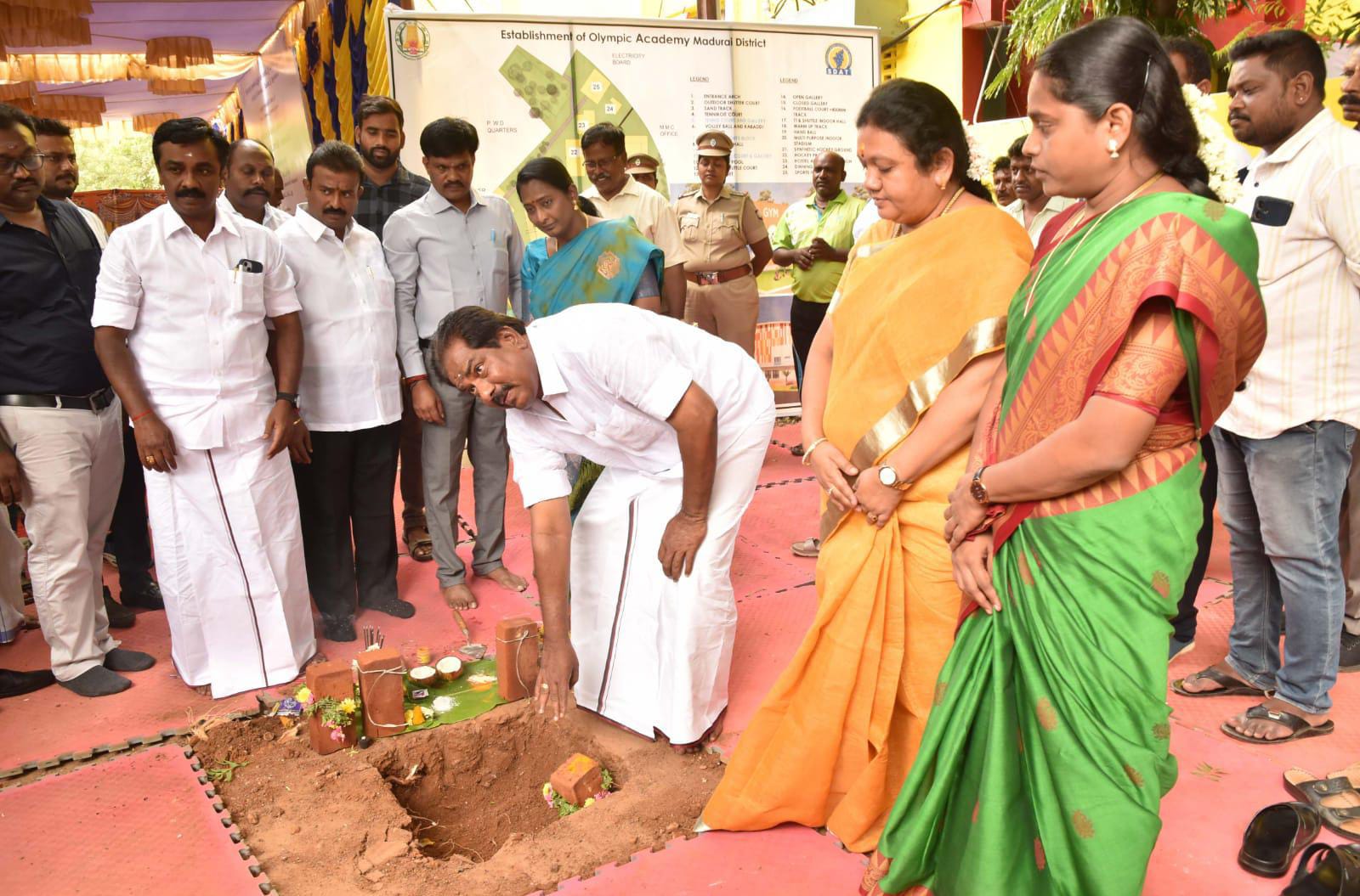 மதுரை மாவட்ட விளையாட்டு மைதான வளாகத்தில், வணிகவரி மற்றும் பதிவுத்துறை அமைச்சர் பி.மூர்த்தி, தமிழ்நாடு விளையாட்டு மேம்பாட்டு ஆணையம் சார்பில் ரூபாய் 6 கோடி மதிப்பீட்டில் ஒலிம்பிக் அகாடாமி கட்டிடம் கட்டும் பணியினை தொடங்கி வைத்தார்.