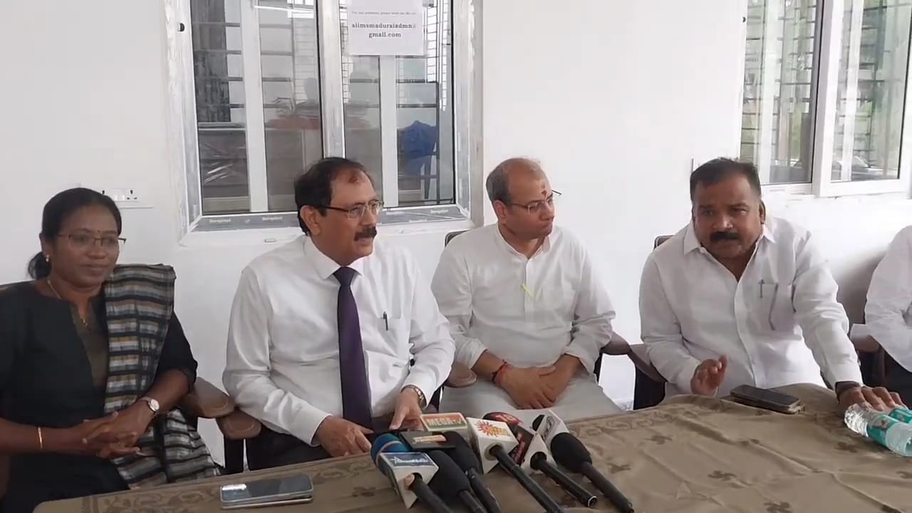 மதுரை மாவட்டம் தோப்பூரில் அமைந்துள்ள எய்ம்ஸ் மருத்துவமனைக்கான அலுவலகத்தில், விருதுநகர் பாராளுமன்ற தொகுதி உறுப்பினர் மாணிக்கம் தாகூர், தென்காசி பாராளுமன்ற உறுப்பினர் ராணி ஸ்ரீகுமார் மற்றும் எய்ம்ஸ் மருத்துவமனை நிர்வாக அதிகாரி அனுமந்த ராவ் உள்ளிட்ட சிலரும், காணொளி வாயிலாக நான்கு பேர் கொண்டநபர் உட்பட எட்டு பேர் கலந்து கொண்ட கலந்தாய்வு கூட்டத்தில் நடைபெற்ற பேச்சுவார்த்தையின் முடிவில், எய்ம்ஸ் மருத்துவமனை நிர்வாக அதிகாரிஅனுமந்த ராவ் நிருபர்களிடம் அளித்த பேட்டியில்,