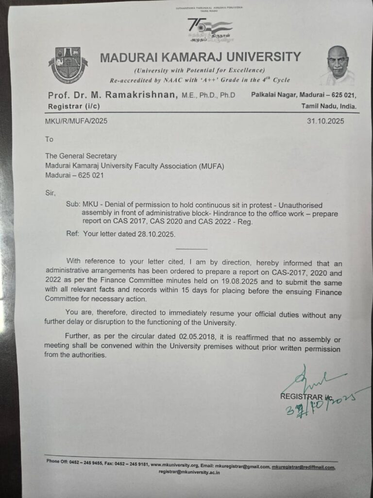மதுரை காமராஜர் பல்கலைக்கழக பேராசிரியர் சங்கம் சார்பில் கடந்த 30ம் தேதி காலை 10 மணி முதல் மதுரை காமராஜர் பல்கலைக்கழக பதிவாளர் அலுவலகம் முன்பு தொடர் உள்ளிருப்பு போராட்டத்தை துவக்கினர்.