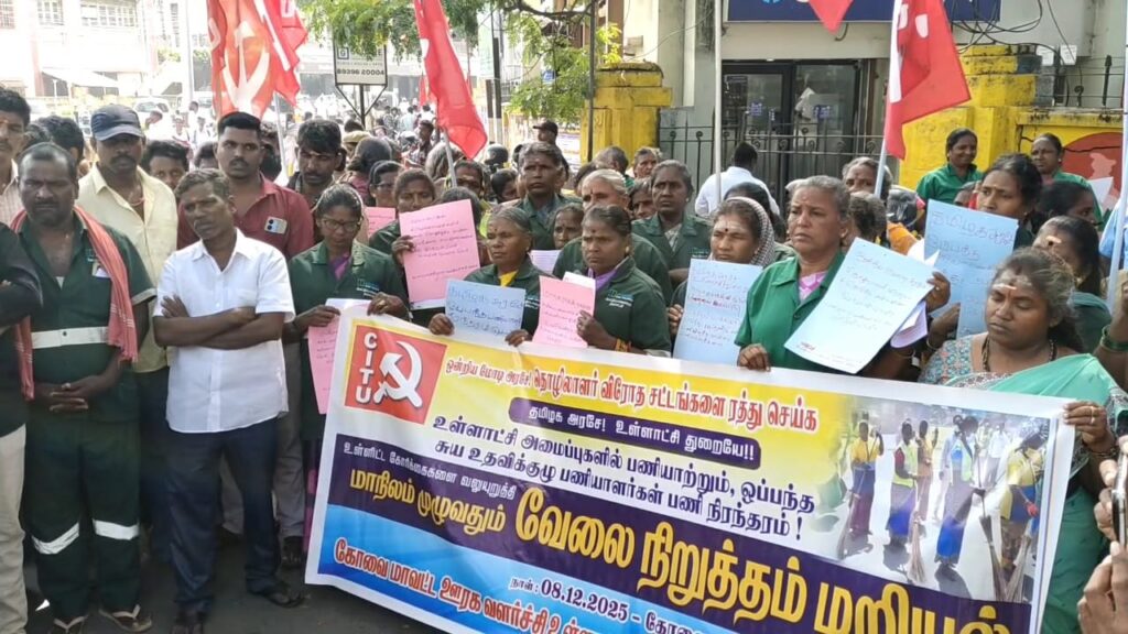 CITU உள்ளாட்சி அமைப்புகளில் பணியாற்றும் ஒப்பந்த தூய்மை பணியாளர்கள், OHT கார்ப்பரேட்டர்கள் இன்று பல்வேறு கோரிக்கைகளை வலியுறுத்தி ஒரு நாள் வேலை நிறுத்த மறியல் போராட்டத்தை தமிழ்நாடு முழுவதும் நடத்தி வருகின்றனர்.