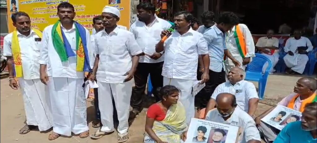கள்ளச்சாராய வியாபாரிகளால் வெட்டி படுகொலை செய்யப்பட்ட இளைஞர்கள் குடும்பத்திற்கு நீதி வழங்க கோரி நடைபெற்ற கண்டன ஆர்ப்பாட்டத்தில், கொலை செய்யப்பட்ட இளைஞரின் தாயார், கதறி அழுது கொண்டிருந்தபடியே மயங்கி விழுந்ததால் பரபரப்பு நிலவியது.