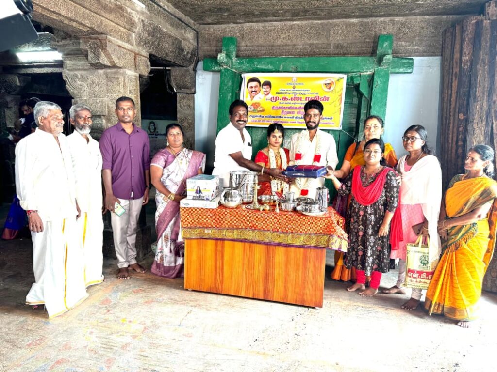 இந்த திட்டத்தின் கீழ் குமரி மாவட்டம் மருங்கூர் சுப்பிரமணிய சுவாமி திருக்கோயிலில் 2 திருமண ஜோடி தம்பதிகளுக்கு இன்று திருமணம் நடந்தது. குமரி மாவட்ட அறங்காவலர் குழு தலைவர் பிரபா ஜி ராமகிருஷ்ணன் தலைமையில், நாகர்கோயில் உதவி ஆணையர் தங்கம், ஆய்வாளர் சரஸ்வதி முன்னிலையில் திருமண ஜோடிகளுக்கு சீர்வரிசை பொருட்கள் வழங்கப்பட்டன. ஏழை, எளிய மக்கள் பயன்பெறும் வகையில், திருக்கோவில் வாயிலாக, 70 ஆயிரம் ரூபாய் மதிப்பிலான பொருட்கள் (4 கிராம் தங்கம், பீரோ, கட்டில், மெத்தை, தலையணை உள்ளிட்டவை) திருமண சீர்வரிசையாக வழங்கப்பட்டது. நிகழ்ச்சியில், ஸ்ரீ காரியம் ராமச்சந்திரன், தர்மேந்திரா, திமுக நிர்வாகிகள் ஸ்டார்மின், விஷ்ணு, மால்டன் ஜினின், சுகந்தன் உட்பட பலர் பங்கேற்றனர்.