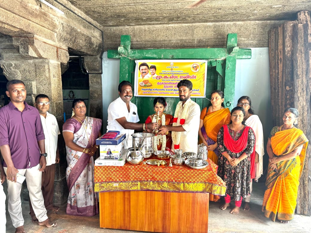 இந்த திட்டத்தின் கீழ் குமரி மாவட்டம் மருங்கூர் சுப்பிரமணிய சுவாமி திருக்கோயிலில் 2 திருமண ஜோடி தம்பதிகளுக்கு இன்று திருமணம் நடந்தது. குமரி மாவட்ட அறங்காவலர் குழு தலைவர் பிரபா ஜி ராமகிருஷ்ணன் தலைமையில், நாகர்கோயில் உதவி ஆணையர் தங்கம், ஆய்வாளர் சரஸ்வதி முன்னிலையில் திருமண ஜோடிகளுக்கு சீர்வரிசை பொருட்கள் வழங்கப்பட்டன. ஏழை, எளிய மக்கள் பயன்பெறும் வகையில், திருக்கோவில் வாயிலாக, 70 ஆயிரம் ரூபாய் மதிப்பிலான பொருட்கள் (4 கிராம் தங்கம், பீரோ, கட்டில், மெத்தை, தலையணை உள்ளிட்டவை) திருமண சீர்வரிசையாக வழங்கப்பட்டது. நிகழ்ச்சியில், ஸ்ரீ காரியம் ராமச்சந்திரன், தர்மேந்திரா, திமுக நிர்வாகிகள் ஸ்டார்மின், விஷ்ணு, மால்டன் ஜினின், சுகந்தன் உட்பட பலர் பங்கேற்றனர்.