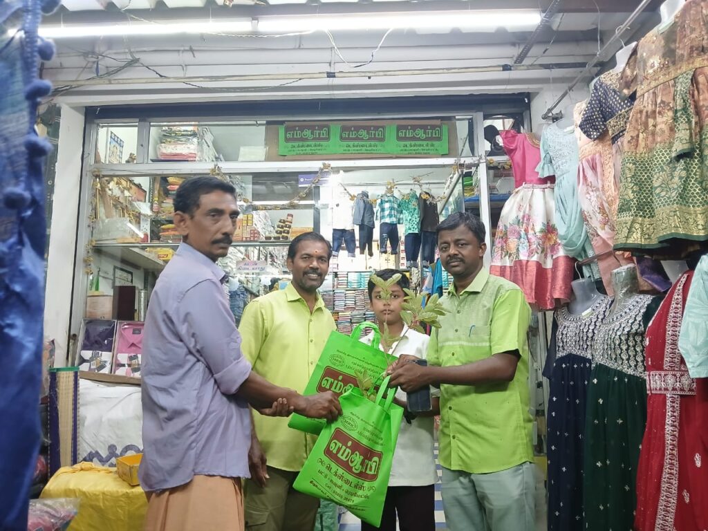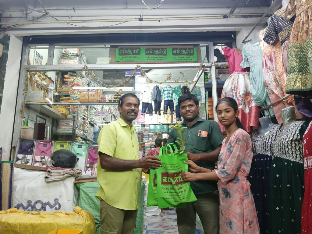 அதன் ஒரு பகுதியாக புதுவித முயற்சியாக சுற்றுச்சூழலின் அவசியத்தை பொதுமக்களிடையே எடுத்துரைத்து விழிப்புணர்வை ஏற்படுத்தும் வகையிலும் மரம் நடுவதன் அவசியத்தை வலியுறுத்தும் வகையிலும் மதுரை மாவட்டம் ஒத்தக்கடை பகுதியில் இயங்கி வரும் எம்ஆர்பி ஜவுளிக்கடையில் புது ஆடைகள் வாங்கும் ஒவ்வொரு வாடிக்கையாளர்களுக்கும் கடையின் உரிமையாளரும் பசுமை செயற்பாட்டாளருமான பாரதிதாசன் மா பலா கொய்யா உள்ளிட்ட பழ வகைகளான மரக்கன்றுகளை வழங்கி விழிப்புணர்வு ஏற்படுத்தி வருகிறார்.
