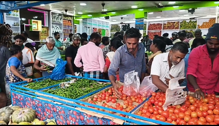 இந்நிலையில் இன்று அந்த காய்கறி மற்றும் பழங்கள் நிலையம் புதிதாக திறக்கப்பட்ட நிலையில் தற்போது காய்கறி விலைகள் கடுமையாக உயர்ந்திருக்கக் கூடிய சூழ்நிலையில் சலுகை விலையில் காய்கறிகள் அங்கு வழங்கப்பட்டதால் அதனை வாங்க பொதுமக்கள் கூட்டம் அலைமோதியது.