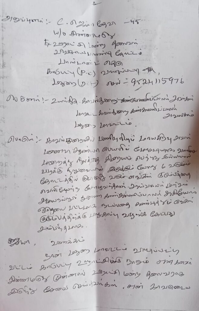 இது குறித்து மேலும் கூறுகையில் அண்ணன் தம்பி மற்றும் நில பிரச்சனையில் காவல்துறையினர் அளவுக்கு அதிகமாக உரிமை எடுத்து தலையிடுவதால் உயிருக்கு ஆபத்து ஏற்படும் நிலை உள்ளது ஆகையால் மாவட்ட காவல் கண்காணிப்பாளர் எனதுமனு மீது உரிய விசாரணை செய்து முன்னாள் ஊராட்சி மன்ற தலைவரான எனக்கு உரிய நீதி வழங்க வேண்டும் என கேட்டுக் கொள்வதாக கூறியுள்ளார் இதுகுறித்து மாவட்ட ஆட்சியர் முதலமைச்சர் தனிப்பிரிவு உள்ளிட்ட அனைவருக்கும் மனு அளித்துள்ளேன் விரைவில் மாவட்ட ஆட்சித் தலைவரை நேரில் சந்தித்து தீர்வுகோரி முறையிட உள்ளதாக தெரிவித்தார்.