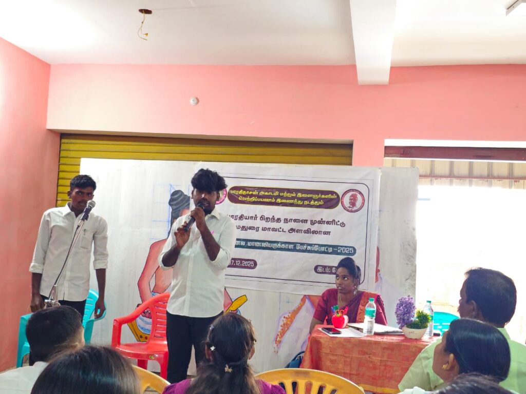 மதுரை மாவட்டம் மேலூரில் பாரதிதாசன் அகாடமி மற்றும் இளைஞர்களின் வெற்றி பயணம் சார்பாக மகாகவி பாரதியார் பிறந்த நாளை முன்னிட்டு மதுரை மாவட்ட அளவிலான மாபெரும் பேச்சுப்போட்டி நடைபெற்றது.