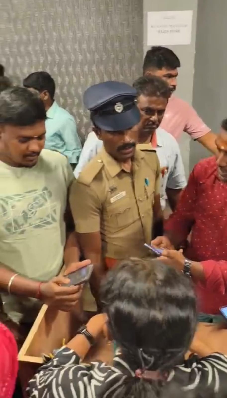 ஒரு வயது குழந்தைகளுக்கு என்ன ? தெரியப் போகிறது என்றும், புக் மை ஷோ செயலியில் பதிவு செய்தால், பணம் திருப்பி கிடைக்காது என்றும், திரையரங்கில் வந்து கேட்டதற்கு 7 நாட்கள் பிறகு தான் கிடைக்கும் என்றும் கூறுகிறார்கள். ஏழு நாட்கள் பிறகு எப்படி வருவார்கள் ? அதற்கு யாரு உத்தரவாதம் ? என்றும், செயலிலும் எந்த ஒரு ஆதாரங்களும் கேட்கவில்லை, திரையரங்கு வந்து கேட்டதற்கு எந்த ஒரு தகவலும் இல்லை, காவல் துறை மற்றும் தனியார் காவலர்கள் மட்டும் தடுக்கின்றனர். மற்றபடி எந்த ஒரு பதிலும் இல்லை என்று வாக்குவாதத்தில் ஈடுபட்ட ரசிகர்கள் .