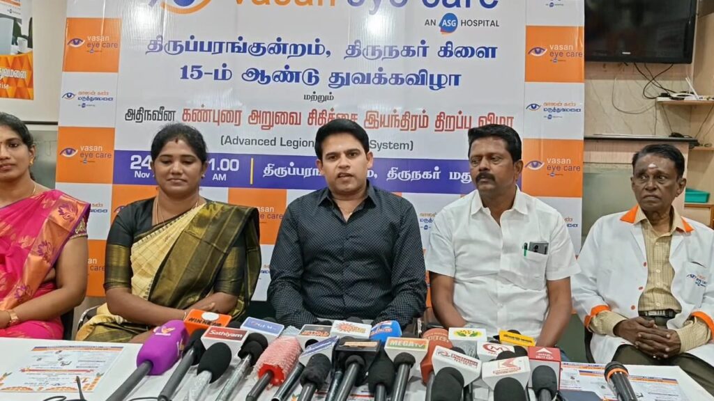 மதுரை திருப்பரங்குன்றம் அருகே உள்ள திருநகரில் வாசன் கண் மருத்துவமனை உள்ளது 15 ஆண்டு துவக்க விழாவும் புதிய அதிநவீன கண் அறுவை சிகிச்சை எந்திரம் மற்றும் அறுவை சிகிட்சை அரங்கம் திறப்பு விழா நடைபெற்றது.