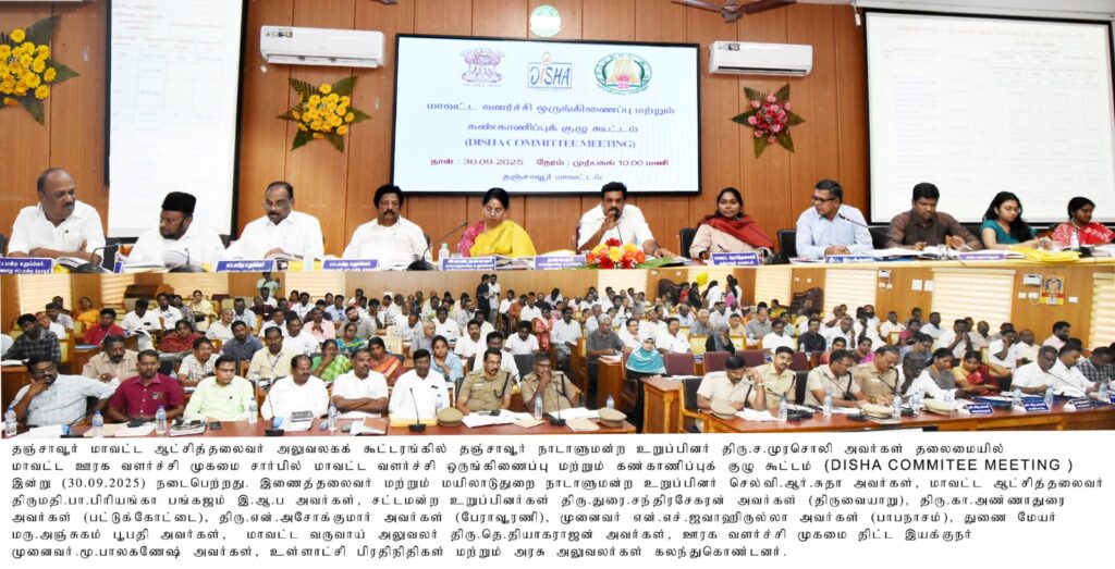 தஞ்சாவூர் மாவட்டத்தில் மாவட்ட ஊரக வளர்ச்சி முகாமை சார்பில் மாவட்ட வளர்ச்சி ஒருங்கிணைப்பு மற்றும் கண்காணிப்புக் குழு கூட்டம் குழுத்தலைவர் மற்றும் தஞ்சாவூர் நாடாளுமன்ற உறுப்பினர் முரசொலி தலைமையில் நேற்று நடைபெற்றது.