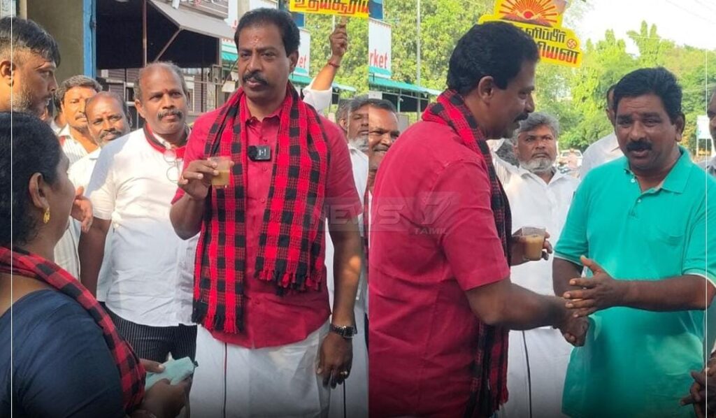 திண்டுக்கல் திமுக வேட்பாளர் தேநீர் கடையில் வாக்கு சேகரித்தார்.