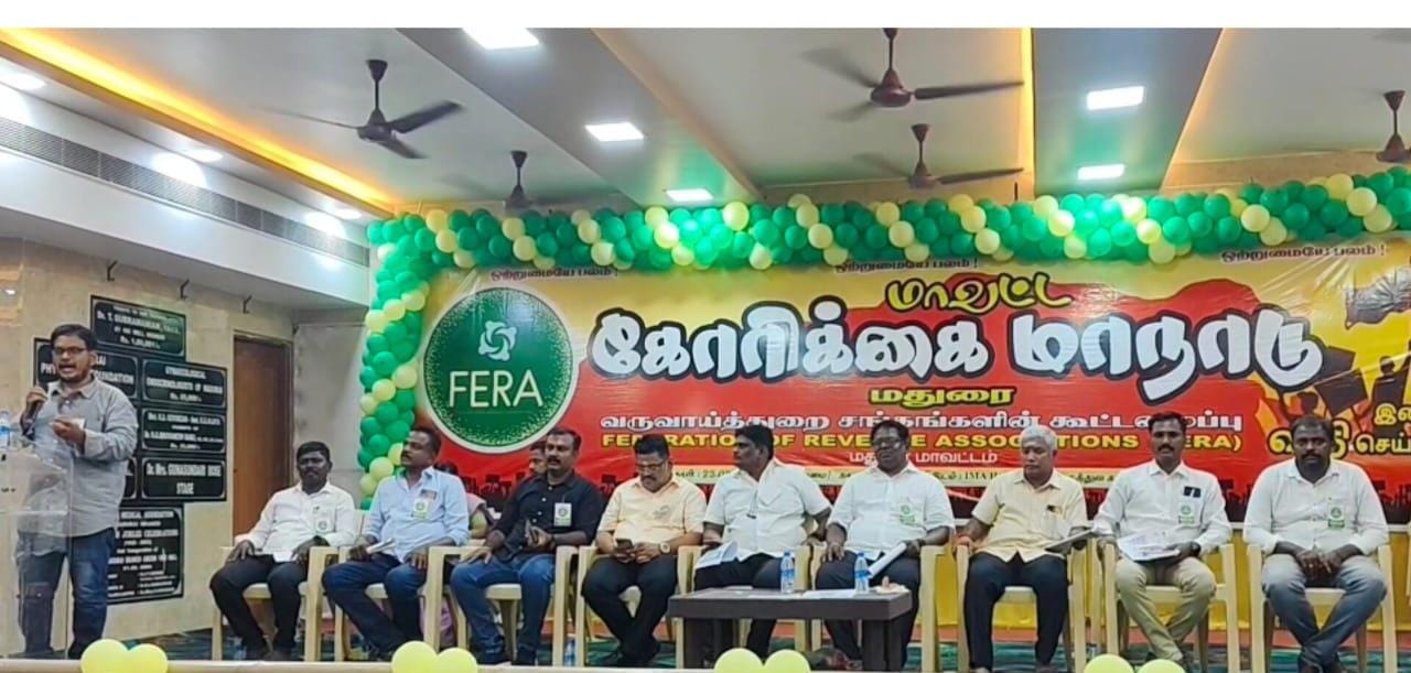 மதுரை மருத்துவக் கல்லூரி கூட்ட அரங்கில் வருவாய்த்துறை சங்கங்களின் கூட்டமைப்பின் சார்பில் மாவட்ட மாநாடு தமிழ்நாடு வருவாய்த்துறை அலுவலர் சங்கத்தின் மாநில துணைத்தலைவரும், வருவாய்த்துறை சங்கங்களின் கூட்டமைப்பின் உயர்மட்ட குழு உறுப்பினருமான தமிழ்ச்செல்வன் தலைமையில் நடைபெற்றது, பணி பாதுகாப்பு சட்டம், வாரிசுப்பணி, காலி பணியிடங்களை நிரப்புதல் உள்ளிட்ட ஏழு கோரிக்கைகளை முன்வைத்து மாநாட்டில் விவாதிக்கப்பட்டது.