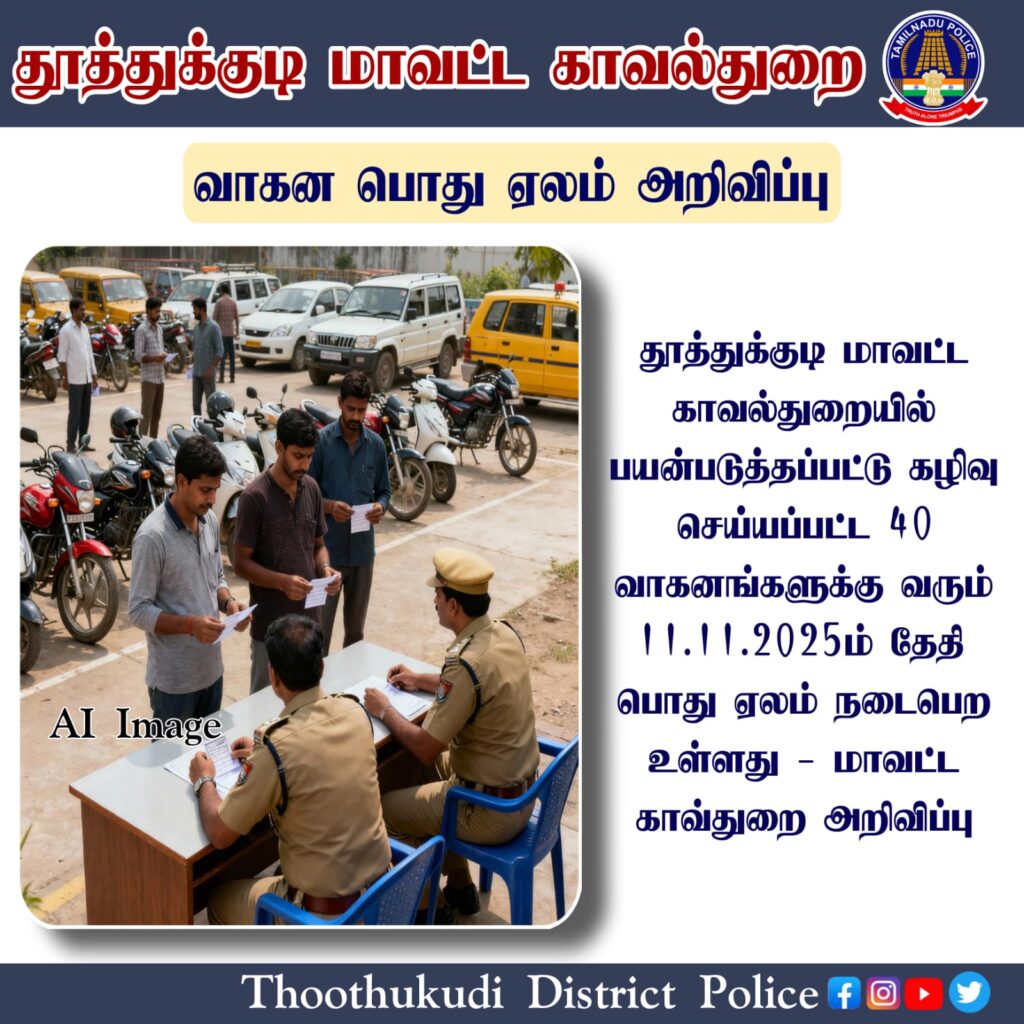 தூத்துக்குடி மாவட்ட காவல்துறையில் பயன்படுத்தப்பட்டு கழிவு செய்யப்பட்ட 26 இருசக்கர வாகனங்கள் மற்றும் 14 நான்கு சக்கர வாகனங்கள் என மொத்தம் 40 வாகனங்கள் எந்த நிலையில் உள்ளதோ அதே நிலையில் வருகின்ற 11.11.2025 செவ்வாய்க்கிழமை காலை 10.00 மணிக்கு தூத்துக்குடி மாவட்ட காவல் அலுவலகம் முன்பு உள்ள மைதானத்தில் வைத்து பொது ஏலம் நடைபெற உள்ளது.