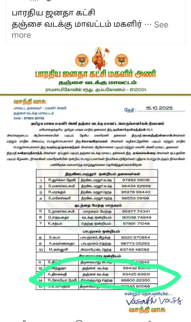 தஞ்சாவூர் மாவட்டம் ஒன்றிய மகளிரணி. பொறுப்பாளராக திருமதி திலகவதி ஆறுமுகம் நியமனம் செய்யப்பட்டுள்ளார். எனவும் டெல்லி பிஜேபி அலுவலகத்தில் இருந்து வரும் தகவல்கள் தெரிவிக்கின்றன. மகளிரணி சம்பந்தமான புகார்கள் திலகவதியிடம் தெரிவிக்கலாம் எனவும். பிஜேபி அலுவலகம் தெரிவித்துள்ளது என்பது குறிப்பிடத்தக்கது.