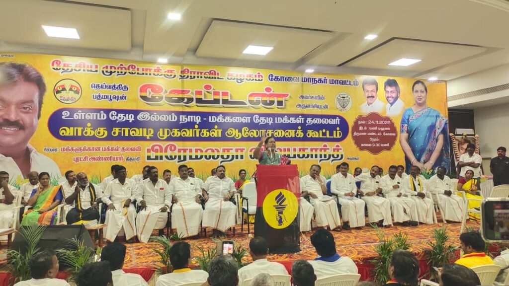 நாம் கேப்டன் போட்டுக் கொடுத்த பாதையிலே பயணிப்போம் என்றும் வெகுவிரைவில் இளைஞர் அணி செயலாளராக விஜயபிரபாகர் அறிவிக்கப்படுவார். அவர் ஜூனியர் கேப்டன் கோவையின் செல்ல பிள்ளை என்றார். மரியாதை நிறைந்த ஊர் கோவை, மரியாதை என்றால் என்ன? சுத்தம் என்றால் என்ன? என்பதை கோவையில் தான் கற்றுக் கொள்ள வேண்டும் குப்பைகள் இல்லாத மாநகராட்சியாக கோவை இருந்தது ஆனால் தற்பொழுது இல்லை என்று குறிப்பிட்ட அவர் 2026க்கு பிறகு தேமுதிக கூட்டணி சுத்தம் செய்து காட்டும் என தெரிவித்தார். சிறுவாணி நீரையும் அசுத்தம் செய்து விட்டார்கள் என தெரிவித்த அவர் இதனை நினைத்து தலைகுனிகிறேன் என்றார். கோவை தென்னிந்தியாவின் மான்செஸ்டர் ஆக அப்போது இருந்தது ஆனால் தற்பொழுது இல்லை மீண்டும் கோவை மாவட்டம் தென்னிந்தியாவின் மான்செஸ்டர் ஆக மாற வேண்டும் என தெரிவித்தார்.
