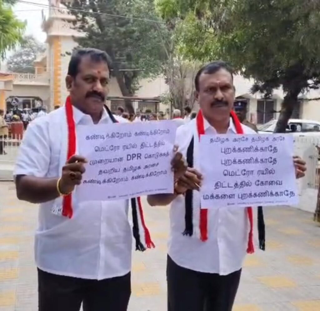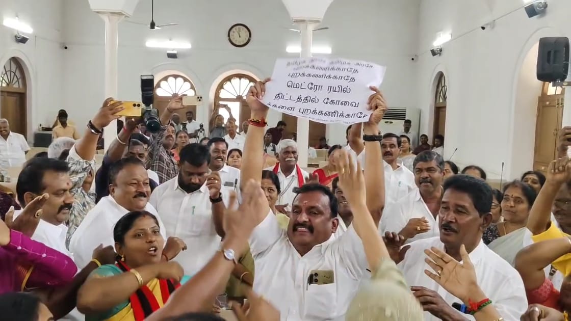 பின்னர் மேயர் ரங்கநாயகி தலைமையில் மாநகராட்சி கூட்டம் நடைபெற்றது அப்பொழுது காங்கிரஸ் கட்சி உறுப்பினர்கள் மெட்ரோ ரயில் திட்டத்தை மத்திய அரசு புறக்கணித்ததை கண்டித்து தீர்மானம் கொண்டு வர வேண்டும் என்று பேசியதால், அதற்கு அ.தி.மு.க வின் உறுப்பினர்கள் பொய் கூறி போலி வேஷம் போடாதீர்கள் என்றும், மெட்ரோ ரயில் வராததற்கு தி.மு.க தான் காரணம் என்று கூறினார். இதைத் தொடர்ந்து தி.மு.க உறுப்பினர்கள் நீங்கள் போலி வேஷம் போடாதீர்கள் என்று அ.தி.மு.க கவுன்சிலர்களிடம் தி.மு.க உறுப்பினர்கள் முற்றுகையிட்டு, வாக்குவாதத்தில் ஈடுபட்டதால் பரபரப்பின் நிலவியது, இந்நிலையில் கூட்டத்தில் இருந்து அ.தி.மு.க கவுன்சிலர்கள் வெளிநடப்பு செய்தனர்.