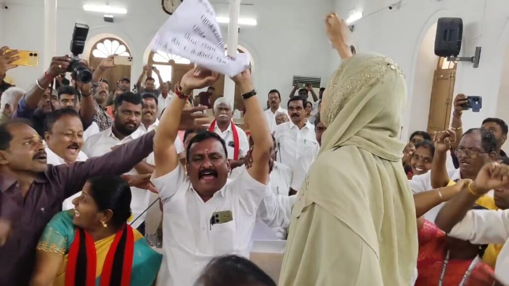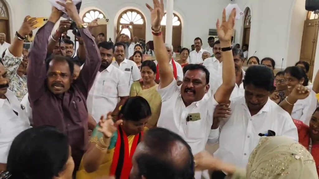 அங்கே போலீசார் விரைந்து சென்றனர். அதன் பிறகு தி.மு.க கூட்டணி கட்சி கவுன்சிலர்கள் அங்கு இருந்து கூட்டத்திற்கு சென்று பங்கேற்றனர்.