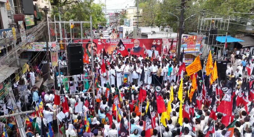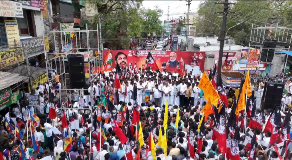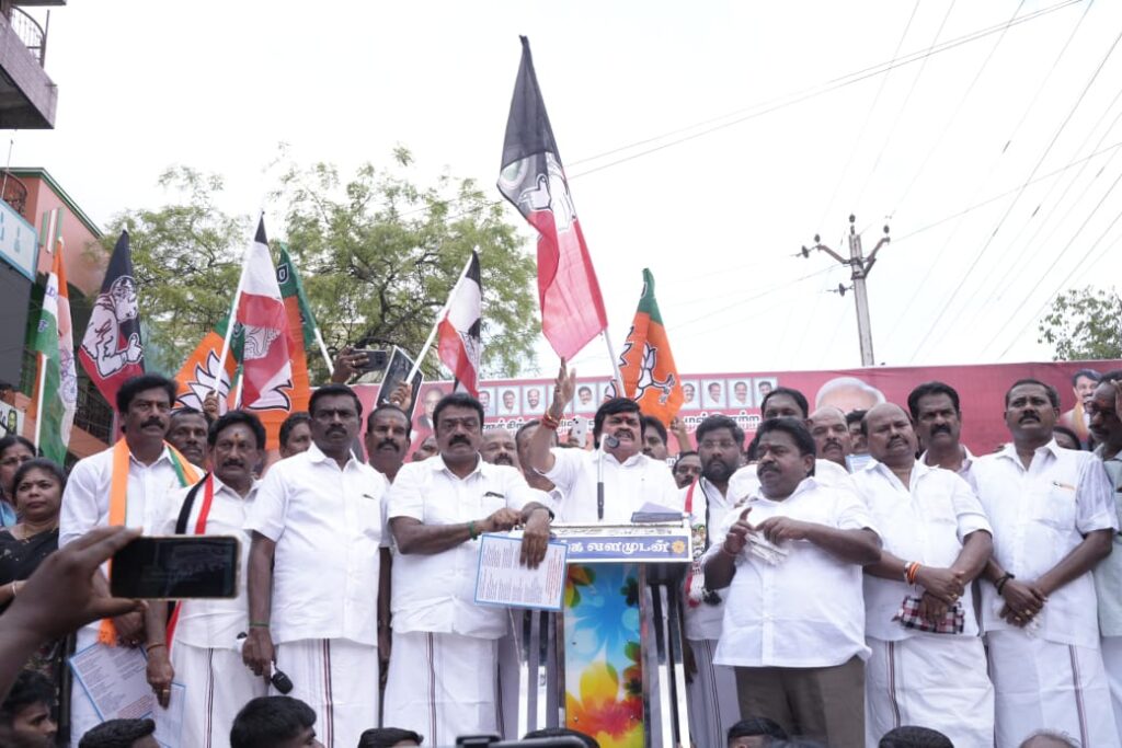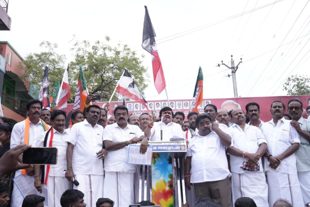 இந்த ஆர்பாட்டத்தில் தேசிய ஜனநாயக கூட்டணியை சேர்ந்த பாஜக பாமக தமிழ் மாநில காங்கிரஸ் அமமுக உள்ளிட்ட கட்சிகளை சேர்ந்த தொண்டர்கள் மற்றும் நிர்வாகிகள் என ஏராளமானவர்கள் கலந்து கொண்டனர்