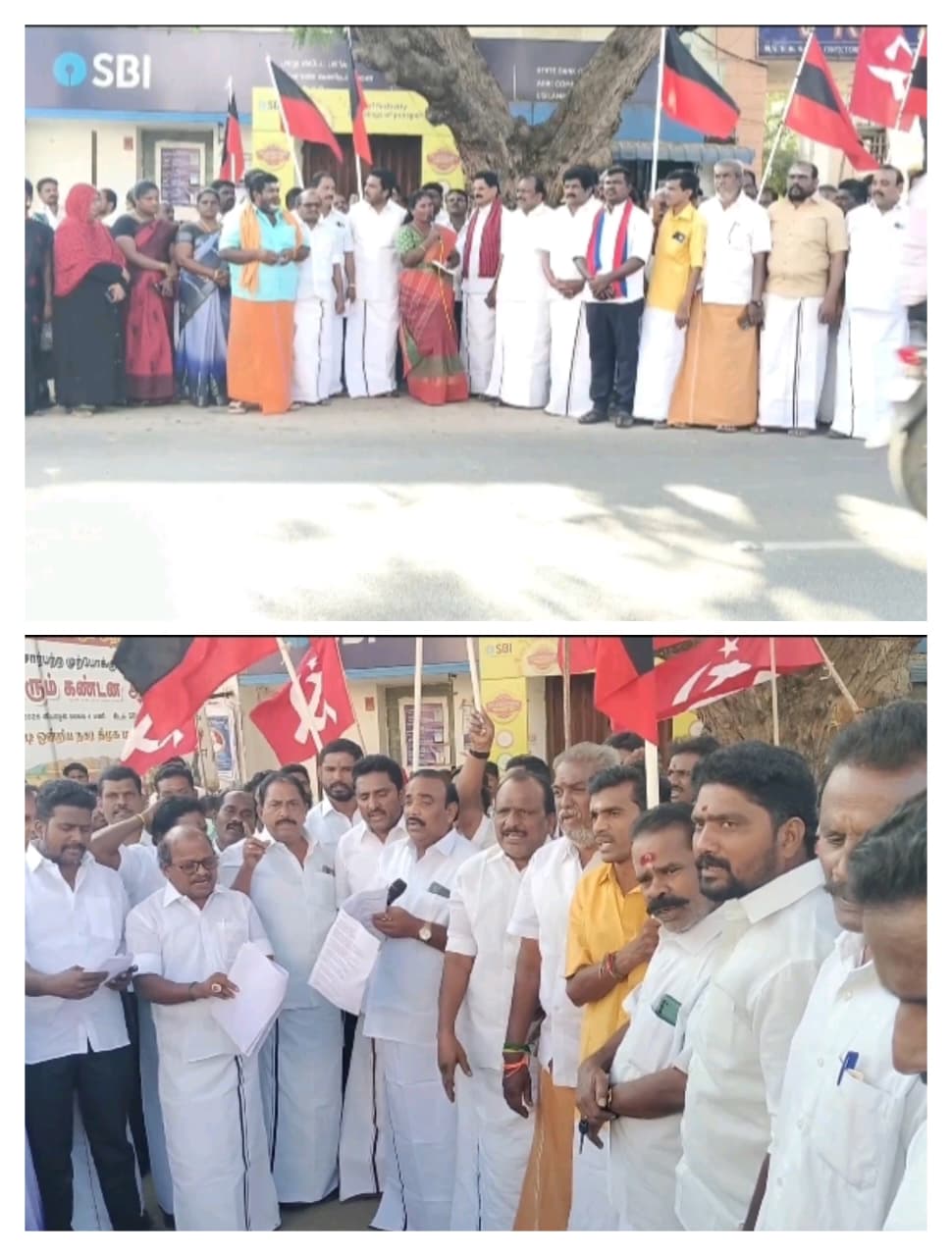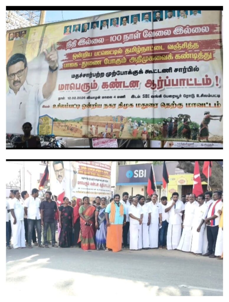 இதன் ஒரு பகுதியாக மதுரை மாவட்டம் உசிலம்பட்டி பாரத ஸ்டேட் வங்கி முன்பு உசிலம்பட்டி திமுக நகர செயலாளர் தங்கப்பாண்டியன் தலைமையில் மதச்சார்பற்ற முற்போக்கு கூட்டணி நிர்வாகிகள் கண்டன ஆர்ப்பாட்டத்தில் ஈடுபட்டனர்.