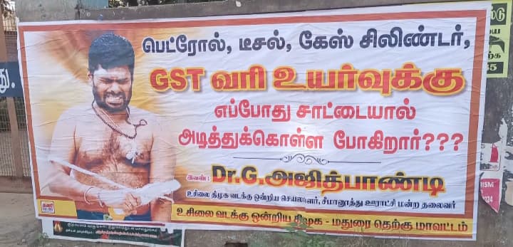 ஜீஎஸ்டி வரி மற்றும் பெட்ரோல், டீசல் விலை உயர்வுக்கு எப்போது அண்ணாமலை சாட்டையால் அடித்துக் கொள்ள போகிறார்? என உசிலம்பட்டியில் திமுகவினர் போஸ்டர் ஒட்டி கேள்வி எழுப்பியுள்ளது பரபரப்பை ஏற்படுத்தியுள்ளது.