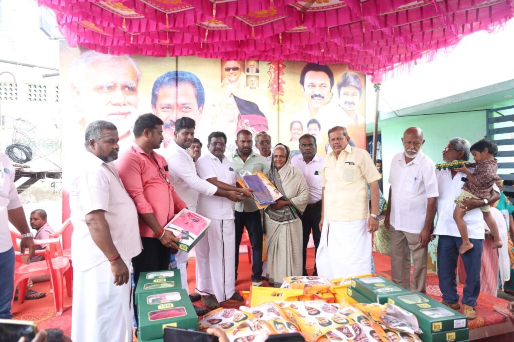 இந்நிகழ்வில் அஞ்சல் துறை கணேசன், வார்டு செயலாளர் செந்தில்குமார், மேற்கு பகுதி இளைஞரணி துணை அமைப்பாளர் ஹரிகரன், பேரின்ப முத்து, ஜேம்ஸ் உள்ளிட்ட வார்டு பிரதிநிதிகள் நிர்வாகிகள் பொதுமக்கள் என ஏராளமானோர் கலந்து கொண்டனர். 2100 பேருக்கு இலவச வேட்டி சேலை களங்கம் நிகழ்வு திண்டுக்கல் மாநகராட்சி பகுதியில் பெரும் பரபரப்பை ஏற்படுத்தி உள்ளது.